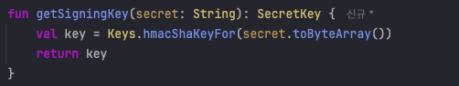 또한 기존의 setSigningKey() 가 verifyWith() 로 변경되면서 Key 타입을 publicKey / secretKey 타입중 일치하는 걸로 명시해줘야한다. 결과적으로 기존에 Key로 반환되던 타입을 SecretKey로 특정하여 생성하도록 변경하였다.